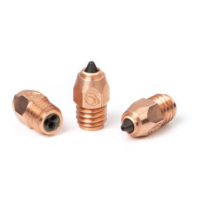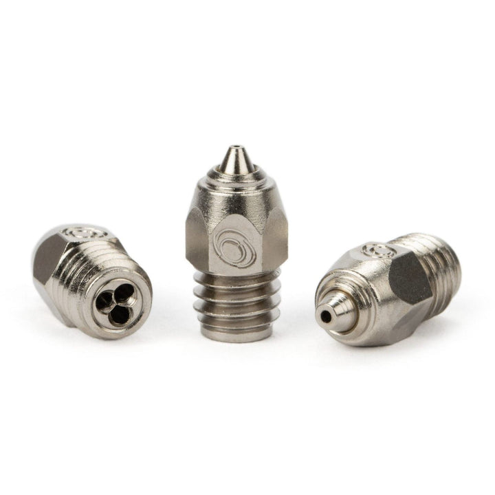 Les buses CHT® divisent le filament en trois fines mèches, ce qui permet une fusion plus rapide de l'intérieur. Cela permet des débits nettement plus élevés et des temps d'impression plus courts. Le revêtement en nickel réduit également l'adhérence du filament et protège la surface contre la corrosion.
