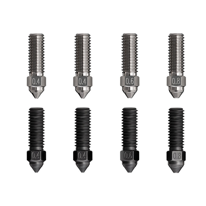 Les buses sont fabriquées en alliage de cuivre à haute conductivité thermique allant jusqu'à 330 W/m.k, garantissant un chauffage uniforme. La buse a un volume deux fois plus grand que celui des buses ordinaires et supporte des vitesses d'impression élevées allant jusqu'à 600 mm/s. Un revêtement uniforme en nickel réduit l'adhérence des filaments et assure une extrusion plus lisse. La construction en acier trempé offre une grande dureté, une meilleure résistance à l'usure et une durée de vie prolongée. De plus, la buse est résistante à la corrosion, ce qui augmente encore sa durabilité.