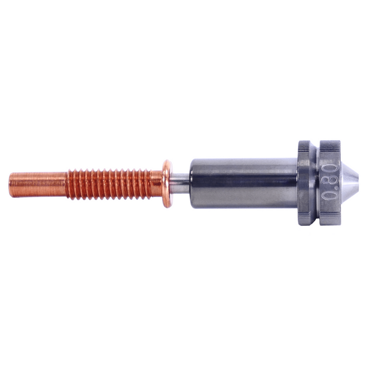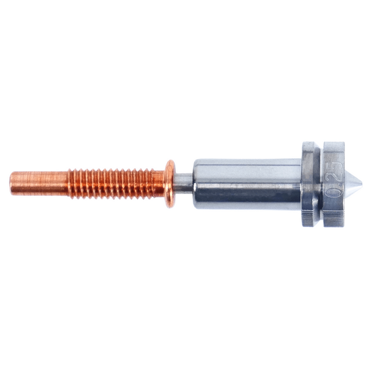 Les buses HTX sont des buses résistantes à haute température et à l'usure. Semblables aux buses ObXidian, les buses HTX disposent d'une pointe en acier trempé, d'un support en cuivre et d'un segment de distribution en cuivre pour optimiser le transfert de chaleur vers le dissipateur thermique. La buse est également revêtue de nitrure de chrome pour garantir une résistance à l'usure jusqu'à 500 °C.