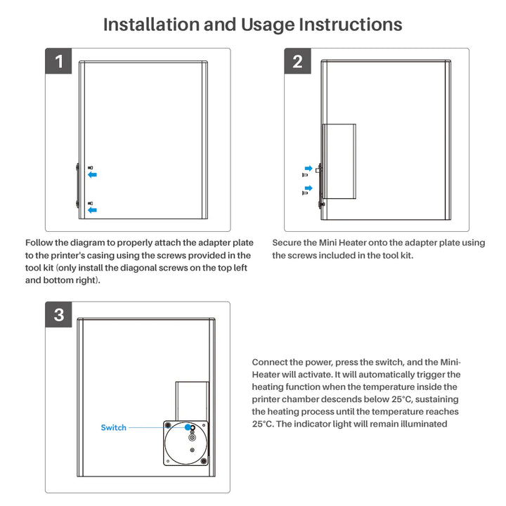 Le Mini Chauffage est notamment compatible avec : Mars 5 Ultra, Mars 5, Mars 4 Max, Mars 4 DLP, Saturn 4, Saturn 4 Ultra, Saturn 3, Saturn 3 Ultra, Saturn 2, Saturn 8K, Saturn S et Jupiter SE. Convient également aux imprimantes d'autres fabricants (avec plaque adaptatrice).