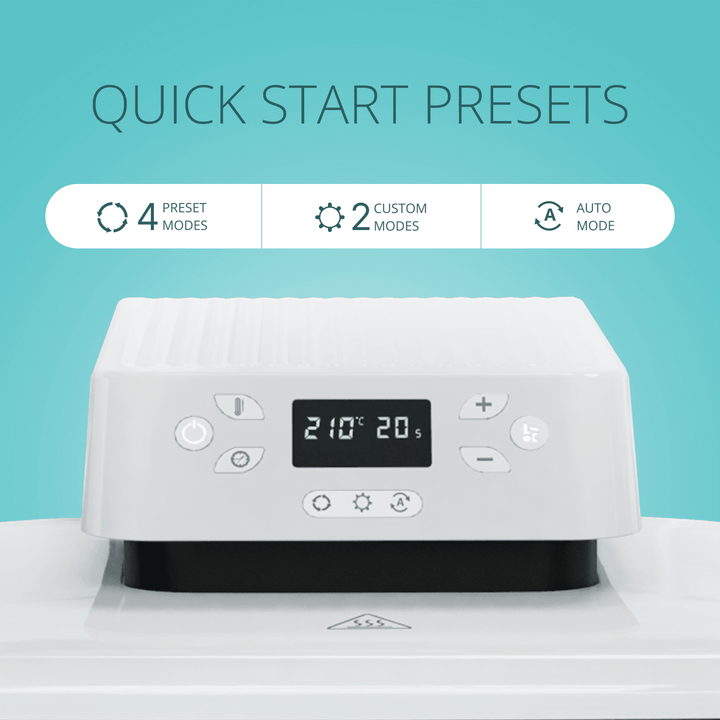 - Démarrez le processus de pressage : réglez simplement le temps et la température ou choisissez l'un des préréglages pratiques, puis appuyez sur démarrer. La presse à chaud automatique s'occupe du reste pour vous.