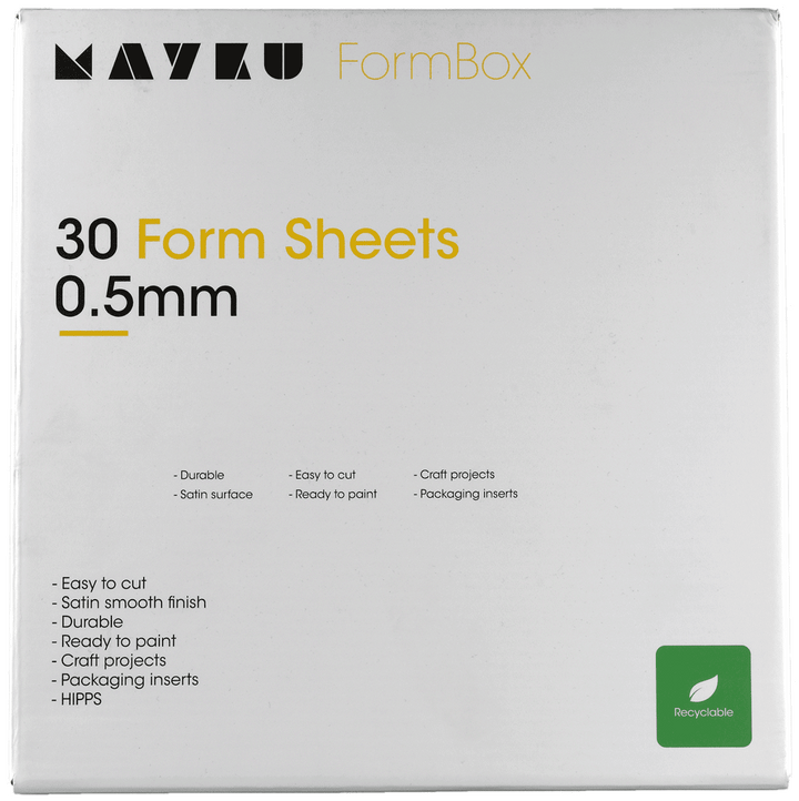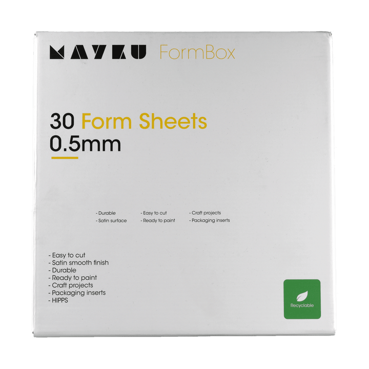 Les Feuilles de Forme Mayku FormBox sont spécialement conçues pour la Mayku FormBox et offrent une surface satinée durable pour des projets créatifs et fonctionnels. Avec une épaisseur de 0,5 mm, les plaques conviennent parfaitement pour emballages de produits, prototypes et travaux d'artisanat décoratif. Le matériau est partiellement fabriqué à partir de plastique recyclé et 100 % recyclable – pour des résultats durables sans compromis.