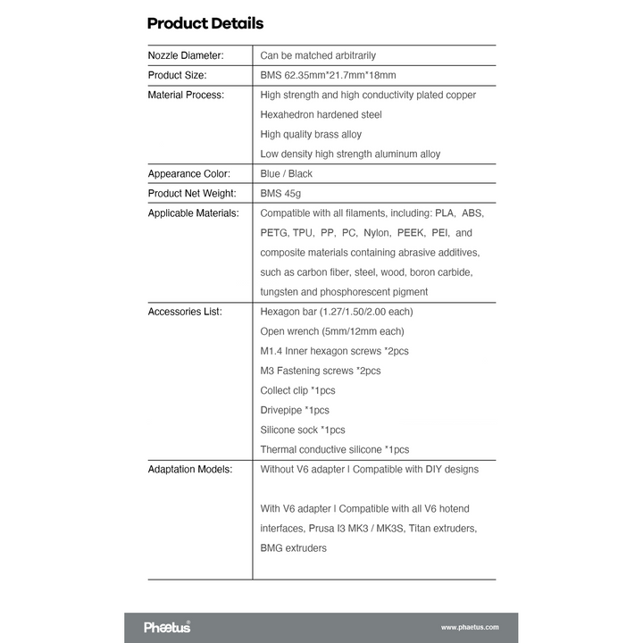Voici quelques spécifications techniques du Phaetus Dragonfly Hot-End BMS :